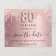 Tenga en cuenta que esta opción Guardar la fecha está en papel de volante y es muy delgada. Los sobres no están incluidos. Para más grueso Guardar la tarjeta de fecha (mismo diseño), por favor visite nuestra tienda. Una chica y de moda Salven la Fecha para una fiesta de cumpleaños número 80. Fondo de gradiente rosa Rubor decorado con oro rosa y purpurinas de plata falsos goteo y polvo. Personalice y agregue una fecha y un nombre/texto. El texto: Save the Date se escribe con un gran guión de estilo con letras a mano y a la moda con guiones. Número 80 con un tipo de letra de estilo globo.