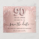 Tenga en cuenta que esta opción Guardar la fecha está en papel de volante y es muy delgada. Los sobres no están incluidos. Para más grueso Guardar la tarjeta de fecha (mismo diseño), por favor visite nuestra tienda. Una chica y de moda Salven la Fecha para una fiesta de cumpleaños número 90. Fondo de gradiente dorado Subió decorado con goteo de oro rosa y purpurinas de plata falsa. Personalice y agregue una fecha y un nombre/texto. El texto: Save the Date se escribe con un gran guión de estilo con letras a mano y a la moda con guiones. Número 90 con un tipo de letra de estilo globo.