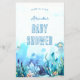 Una elegante ducha de bebé "adivina las características del bebé" hoja de juego para un niño fiesta de ducha de bebé con un tema bajo el mar. Presenta una escena submarina, pintada en acuarela, de peces gelatina, peces, algas marinas y agua. Parte de la "Cute Whale Boy Baby Shower Invitation Suite", un juego de invitación para bebés con ducha.