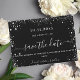 Un Ahorra la fecha moderno y elegante para una boda. Un fondo negro decorado con brillo plateado falso. destellos. Personalice y agregue una fecha y nombres. El texto: Ahorra la fecha está escrito con una fuente de letra grande y de moda.