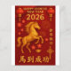 Celebre el Año del Caballo con estilo con esta elegante tarjeta de felicitación de Año Nuevo chino 2026. Con un audaz y galopante caballo de oro montado sobre un rico fondo rojo, acentuado con farolillos tradicionales, fuegos artificiales y flores de cerezo, este diseño captura el espíritu del año del Caballo de Fuego — simbolizando energía, éxito y buena fortuna. La parte delantera de la tarjeta muestra "Feliz Año Nuevo Chino 2026" junto con la frase china 馬 到 功 ("El éxito llega con el caballo"), mientras que la parte trasera de la tarjeta ofrece un refinado saludo rojo y dorado con los personajes chinos 年 快 ^ ("Feliz Año Nuevo"). Perfecto para enviar cálidos deseos a la familia, amigos, clientes y socios de negocios, esta tarjeta combina tradición con elegancia — haciéndolo un placer para ellos. Palabras clave: tarjeta china de Año Nuevo, año del caballo 2026, tarjeta de saludo de caballo de fuego, tarjeta roja y dorada de Año Nuevo Lunar, 馬 到 成, 新 快 功, tarjeta de vacaciones asiática, tarjeta china festiva, tarjeta de saludo de Zazzle