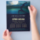 Yoga Fitness Studio / Instructor de Meditación / Entrenador Personal / Entrenador de Vida / Healer / Maestro Reiki / Terapia de Masaje Planilla de Volante de Casa Abierta - Elegante Pose de Meditación de Yoga / Salutación de la Luna // Posada de Luna Crescent / Pose Lunge Media Luna (Ardha Chandrasana) / Surya Namaskar / Anjaneyasana Pose / Salut tation / Warrior 1 Yoga Pose / Chandra Namaskar / Silhouette al lado del Lago Shore en la noche de la luna.