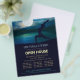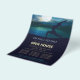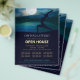Yoga Fitness Studio / Instructor de Meditación / Entrenador Personal / Entrenador de Vida / Healer / Maestro Reiki / Terapia de Masaje Planilla de Volante de Casa Abierta - Elegante Pose de Meditación de Yoga / Salutación de la Luna // Posada de Luna Crescent / Pose Lunge Media Luna (Ardha Chandrasana) / Surya Namaskar / Anjaneyasana Pose / Salut tation / Warrior 1 Yoga Pose / Chandra Namaskar / Silhouette al lado del Lago Shore en la noche de la luna.