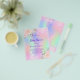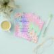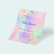 Un fondo de color holográfico de arcoíris en púrpura, rosa, verde menta, dorado rosa. Decorado con brillo falso rosa claro, destellos. Personalice y agregue un nombre y detalles de la fiesta. El nombre está escrito con un estilo de letra a mano, letras de color púrpura.