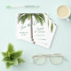 Palmera tropical, presupuesto ahorra la invitación de boda de fecha impresa en papel de volante. Una sola palmera en el centro de las tarjetas blancas con frondas de palma que cuelgan sobre el texto. El texto "Guardar la fecha" está anglonizado. La fecha está en un lado del tronco con los nombres y la ubicación del evento en el otro. En la parte trasera hay un patrón de hojas tropicales en tonos verdes. El color es verde y blanco para un diseño sencillo y limpio.