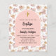Tenga en cuenta que esta invitación está en papel de volante y es muy delgada. Los sobres no están incluidos. Para invitaciones más gruesas (el mismo diseño) visite nuestra tienda. Marco de arco sobre un patrón de pampas hierba y flores rosadas y una cruz dorada. Personalice y agregue un nombre y detalles.