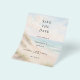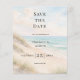 A watercolored sandy beach, sand dunes, ocean waves background. Personalize and add a date and your names. The text: Save the Date is written with a large trendy hand lettered style script.