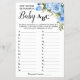 Bebé azul ABC. Juegos de versión en inglés y español incluidos (frontal y posterior). Cambiar el nombre de mamá a nombre de mujer a la plantilla para la versión en inglés y español. Para una personalización adicional (cambio y otra redacción, color de fuente, estilo de fuente ), haga clic en personalizar, desplácese hacia abajo y haga clic en el vínculo "haga clic en el personalizar más adelante". CÓMO REPRODUCIR: Escriba un término de bebé o elementos relacionados que comiencen con cada letra del alfabeto. ¡El primer invitado en terminar la lista gana!
