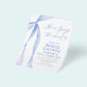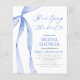 Celebra la futura novia con una hermosa invitación azul a la ducha de novia "Bow, She's Tying the Knot". Este encantador diseño presenta una suave paleta de color azul y un delicado motivo de arco, que simboliza al boda venidero de una manera elegante y lúdica. Perfecto para una sofisticada pero divertida celebración, esta invitación marca el tono de una elegante reunión llena de amor, risa y emoción. Los huéspedes estarán encantados de rendir homenaje a la novia mientras se prepara para atarse el nudo con estilo.