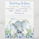 Niño elefante juegos de ducha bebé con un lindo elefante bebé con corbata de arco en un fondo verde azul floral. Estos folletos de juego para bebés con duchas de elefantes son de doble cara con dos juegos diferentes.
