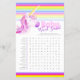 Hermosa cabeza de unicornio pintada a mano con búsqueda de palabras relacionadas con el bebé gráfico de rayas de arcoíris. Ideal para agregar un poco de diversión y competencia ligera a un baby shower temático de arcoíris. Original y caprichosa pintura acuarela de cabeza de unicornio mítico con melena rosa y diseño gráfico de Sarah Trett para www.mylittleeden.com en