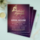 Plantilla de folleto de Casa Abierta de Estudio de Instructor de Fitness de Pilates de Meditación de YOGA aérea - Tipografía de escritura a mano y pose de yoga aérea dorada elegante en fondo de textura roja púrpura burgundy.