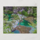 Pintura de la vista desde arriba de cascadas de cascadas y sendero de madera con turistas en el parque nacional de Plitvice, Croacia. El paisaje de las cascadas de los bosques de montaña.