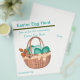 Este volante que anuncia una comunidad de caza de huevos de pascua tiene una apariencia tejida con bonito cesta de Pascua llena de huevos en tonos azul turquesa y un montón de tulipanes color melocotón. La cesta está decorada con un arco de melocotón bonito y una cinta adhesiva. Si lo desea, puede quitar la barra divisoria verde. El texto es un ejemplo y se puede editar o eliminar para adaptarlo a sus necesidades.