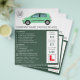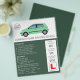 Coche verde moderno, escuela de conducción, folleto publicitario para instructores por la tienda de tarjetas de visita.