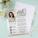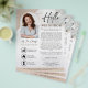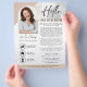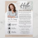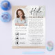 Preséntese y anuncie sus servicios inmobiliarios profesionales con esta plantilla de volante crema moderna de presentación fotográfica de agente inmobiliario Hello Neighbor, con un fondo de textura de gradiente gris suave, iconos, foto del hogar y caligrafía moderna "Hello". Personalice la plantilla a su gusto.