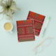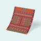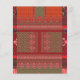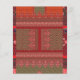 El diseño parece ser un diseño textil tradicional. Presenta un patrón simétrico con una columna central y bordes intrincados a cada lado. La paleta de colores combina tonos tierra como el rojo y el marrón, con motivos detallados en blanco y beige. Los patrones consisten en formas geométricas, figuras parecidas a los diamantes y elementos decorativos que se asemejan a los diseños florales. Este tipo de diseño se asocia a menudo con la artesanía y la artesanía cultural, mostrando la habilidad necesaria para crear patrones tan detallados y complejos. Podría ser parte de una alfombra, un pedazo de ropa u otro objeto textil.