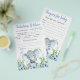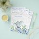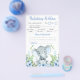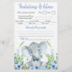 Juegos de baby shower de elefante niño con adorables elefantes bebé con corbata de lazo en un fondo floral azul. Estos volantes de juegos de baby shower de elefante niño son dobles con dos juegos diferentes.