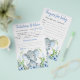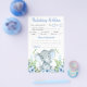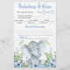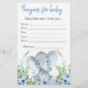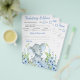 Juegos de baby shower de niño con un adorable elefante bebé en un fondo de flores azules y vegetación. Estos volantes de juegos de baby shower de elefante son de doble cara con dos juegos diferentes.