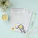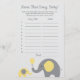Utilice nuestro juego "adivina la canción del bebé" con temas de elefante amarillo y gris para jugar una actividad divertida e interactiva con los clientes de la ducha de bebé. Haz una lista de diez canciones que muestren la palabra "baby" y toquen para tus invitados y haz que adivinen el título y el artista de cada canción.