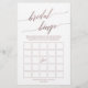 Este elegante juego de bingo dorado con caligrafía de rosa es perfecto para una simple ducha de novia. El diseño rosa oscuro incluye una tarjeta de juegos minimalista decorada con una tipografía romántica y caprichosa de imitación rosa de Relieve metalizado dorado. Personalice la parte delantera de la tarjeta con el nombre de la novia y la fecha de la ducha. Nota: Este diseño no tiene Relieve metalizado de oro rosa real. Es un gráfico de alta calidad hecho para parecer un Relieve metalizado de oro rosa.