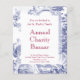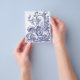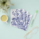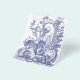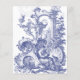 Hermoso patrón de toile azul y blanco con un hombre y un perro rodeados de un marco Rococó o Barroco Tardío.