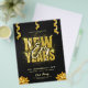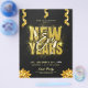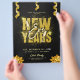 Anuncie su celebración de Nochevieja con este volante, que incluye fuente y fondo purpurina de oro, gafas de champán, cintas de oro y arcos en un fondo negro. Personalizar a su gusto.