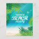 Diseño de fiesta de verano en la playa con palmeras y destellos en el fondo.