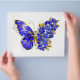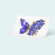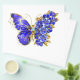 Joyería, azul, zafiro, mariposa floral brillante con ala decorada con flores azules y preciosas con hojas de oro sobre fondo blanco.