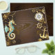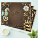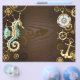 Fondo de madera marrón con mar, cresta mecánica, volante antiguo, ancla dorada y varios engranajes de oro y latón. Estilo Steampunk.