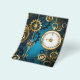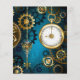 fondo turquesa, texturado, de vapor punk con bronce y oro, llave de plata y reloj. Estilo Steampunk.