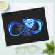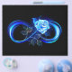 Luminous infinity symbol with glowing, beautiful, lushly blooming rose made of blue flames on black background.