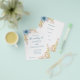 Elegante invitación a bodas de caligrafía con una flor silvestre azul polvorienta rodeada de vegetación salvaje y follaje rosa. Simple y hermoso guión azul polvoriento que se puede editar fácilmente con su información.
