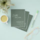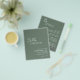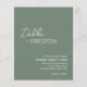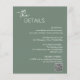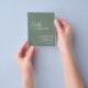 Moderno, verde olivo / presupuesto verde sabio todo en una sola invitación a la boda (impreso en papel delgado de volante - sobres no incluidos) con un diseño simple y mínimo con el nombre de la novia en un guión elegante y el nombre del novio en una fuente contemporánea sans serif. Debajo, en la esquina inferior derecha, están los detalles de los eventos en un diseño minimalista. La parte posterior tiene sus detalles adicionales y el código QR, por lo que puede omitir la tarjeta de gabinete y la tarjeta RSVP.