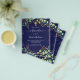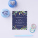 Tenga en cuenta que esta invitación está en papel de volante y es muy delgada. Los sobres no están incluidos. Para invitaciones más gruesas (el mismo diseño) visite nuestra tienda. Un fondo azul marino adornado con vegetación eucalipto, hojas doradas y chispas purpurinas de oro falsas. Una cruz dorada. Personalización y nombre del niño y detalles de la ceremonia. Fondo azul marino.