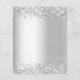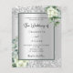 Fondo con apariencia plateada falsa decorado con flores blancas, flores, follaje de eucalipto y purpurina plateada falsa, destellos. Personalice y agregue sus nombres y detalles de la boda. Letras negras.
