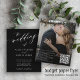Elegante y moderno INVITACIÓN DE BODAS con FOLLETO DE PAPEL económico con texto blanco "la boda de" y fondo negro con una tipografía caligráfica chic y tu CÓDIGO QR (generado automáticamente). Personalízalo con tu foto de compromiso en el reverso y tu texto. ++++++++++ Esta invitación de boda atemporal es adecuada para ceremonias y recepciones de bodas formales de estilo moderno. +++++++++++++++++++++++++++++++++++++ POR FAVOR, LEA ESTO ANTES DE COMPRAR. Esta es una tarjeta económica impresa en un FOLLETO. ++++ Tenga en cuenta que el PAPEL ECONÓMICO ES FINO - Puedes actualizar para que esta tarjeta se imprima en cartulina ++++ SOBRES NO INCLUIDOS. +++ Verifique toda la información y ortografía de su texto porque recibirá exactamente lo que ve - nadie más verificará nada antes de imprimir. ++++ Esta tarjeta está diseñada para un tamaño de 4,5" x 5,6". En caso de que elijas otro tamaño de tarjeta y el texto se salga de la página, todo deberá ser corregido antes de agregar
