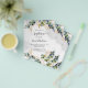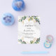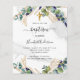 Impresión de mármol como fondo decorado con vegetación de eucalipto y hojas doradas. Una cruz dorada. Personalice y el nombre del niño y los detalles de la ceremonia.