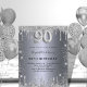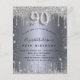Una invitación moderna, elegante y glamurosa para una fiesta de cumpleaños número 90. Un fondo con apariencia plateada falsa, decorado con purpurina. Personalice y agregue su nombre y los detalles de la fiesta. El número 90 está escrito con una fuente de estilo globo, escritura.