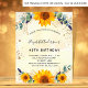 Para una fiesta de cumpleaños de 40 años (o cualquier edad). Un fondo acuarela dorado decorado con girasoles acuarelados, follaje de eucalipto y hojas doradas. Polvo brillante dorado falso. Personalice y agregue sus nombres y detalles de la boda.