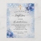 Un bautizo moderno y elegante, celebrando un bebé niño. Fondo con apariencia de plata falsa decorado con brillo azul falso y flores. Una cruz dorada. Personalice y agregue un nombre y detalles de la fiesta. Letras de color negro.