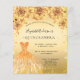 Una invitación moderna, elegante y glamurosa para una Quinceañera, fiesta de cumpleaños número 15. Un fondo de oro falso con destellos de purpurina dorada, un vestido y rosas, flores. El nombre está escrito con un estilo de letra manuscrita moderna. Personalice y agregue los detalles de su fiesta.
