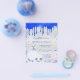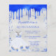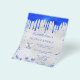 Un fondo con aspecto plateado falso. Decorado con pintura azul real con aspecto de goteo, destellos. Personalice y agregue un nombre y detalles de la fiesta. El nombre está escrito con un estilo de letra manuscrita.