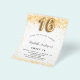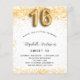 Para una fiesta elegante de Sweet 16, cumpleaños número 16. Un fondo blanco chic. Decorado con brillo de oro falso, destellos. Personalice y agregue un nombre, edad y detalles de la fiesta. El nombre está escrito con un estilo de letra a mano. Número 16 con fuente estilo globo.