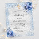 Tenga en cuenta que esta invitación está en papel de volante y es muy delgada. Los sobres no están incluidos. Para invitaciones más gruesas (el mismo diseño) visite nuestra tienda. Un bautismo moderno y elegante, celebrando a un bebé. Un fondo de color falso plateado decorado con falsos purpurinas y flores azules. Una cruz dorada. Personalice y agregue un nombre y detalles del fiesta. Letras de color negro.