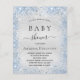 Tenga en cuenta que esta invitación está en papel de volante y es muy delgada. Los sobres no están incluidos. Para invitaciones más gruesas (el mismo diseño) visite nuestra tienda. Una moderna y elegante ducha de bebé, celebrando a un bebé. Fondo de aspecto metálico falso plateado decorado con polvo azul falso purpurina. Personalice y agregue un nombre y detalles del fiesta. Letras de color negro.