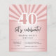 Trae un brillo a tu fiesta de 40 años con este diseño de inspiración retro de colores dorados subió. Fácil para usted de personalizar con todos los detalles del evento! Tonos rosas y rosa pastel a rayas "soleadas", que recuerdan a los años 60, de estilo vintage pero con un toque moderno. Número "40" en letras chunky vintage y las palabras "celebremos" en un tipo de letra caligráfica manuscrita contemporánea, además de campos editables para tu propio contenido.