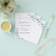 Tenga en cuenta que esta invitación está en papel de volante y es muy delgada. Los sobres no están incluidos. Para invitaciones más gruesas (el mismo diseño) visite nuestra tienda. Un fondo blanco, decorado con estropajes de eucaliptos azul oscuro, estribos. Personalice y agregue un nombre y detalles del fiesta. Fondo azul polvoriento.