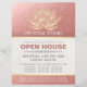 Yoga Studio Meditation Instructor / Life Coach / Healer / Reiki Master / Massage Therapy Open House Flyer Template - Modern Elegant Faux Relieve metalizado dorado Lotus sobre Rosa de Textura de Oro.