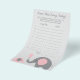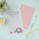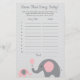 Utilice nuestro juego de "adivinanza de canción de bebé" con tema de elefante rosa y gris para jugar una actividad divertida e interactiva con los invitados de su fiesta de bebé. Cree una lista de reproducción de diez canciones que incluyan la palabra "bebé" y reprodúzcalas para sus invitados y haga que adivinen el título y el artista de cada canción.